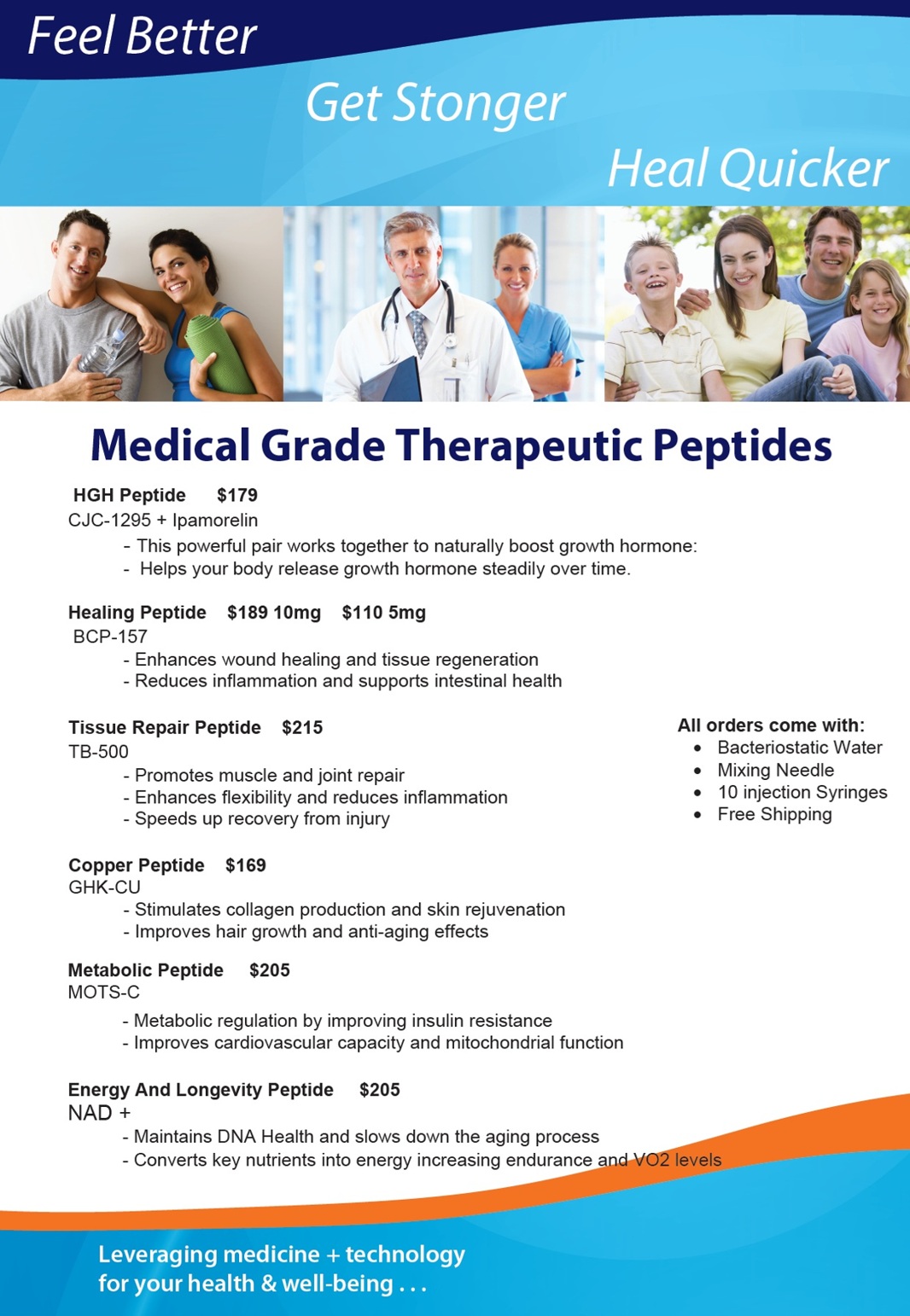 If you are interested in ordering Therapeutic Peptides, please review the types of Peptides and their prices below, then fill out the online form below that and hit submit. Our office staff will reach out to you to confirm your order once we receive your paperwork.